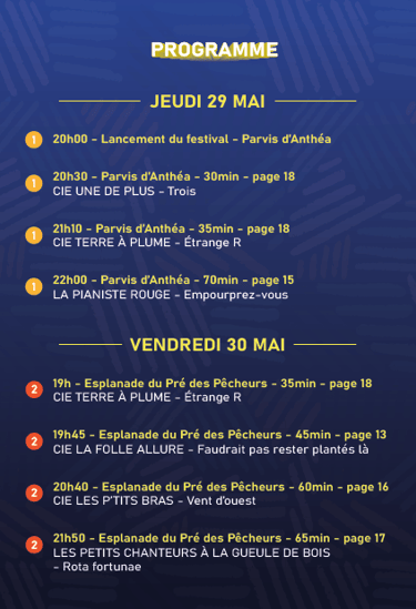 Les espaces publics antibois deviennent des lieux au sein desquels les spectateurs se retrouvent proches d’acteurs, de danseurs, de musiciens, et de circassiens.